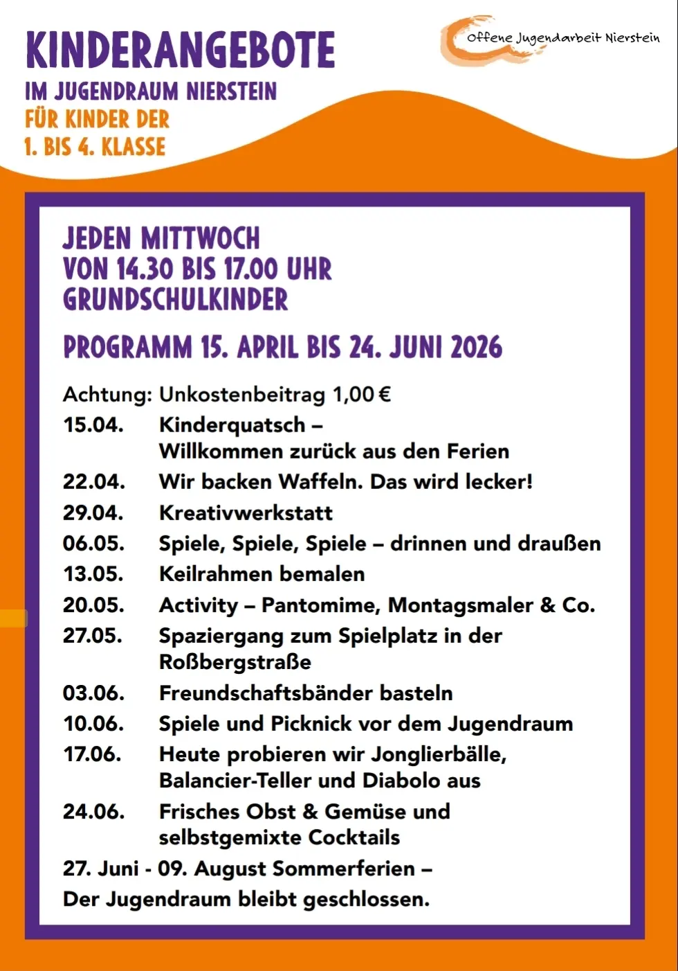 Offene Kinder- und Jugendarbeit bietet Kindern, Jugendlichen sowie jungen Erwachsenen im Alter von 6 bis 27 Jahren Möglichkeiten, ihre freie Zeit gemeinsam zu gestalten und zu erleben. Sie eröffnet ihnen einen sozialen Raum für Begegnungen, Geselligkeit und Bildungszwecke. Sie fördert dabei die Persönlichkeitsbildung und die sozialen Kompetenzen, insbesondere durch die Entwicklung persönlicher und gemeinsamer Fähigkeiten und das Einüben von Verantwortung und Mitwirkung.