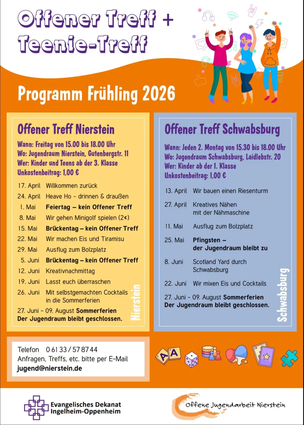 Die Angebote der Offenen Arbeit gliedern sich in den Offenen Treff, den Teenie-Treff, das Kinderprogramm, verschiedene Ferienprogamme sowie Angebote im Jugendraum Schwabsburg.